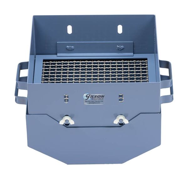 Rocker Screen Set uses manual agitation to quickly and accurately separate coarse-grained samples, whether in the lab or field. The set consists of a bottom pan and a 12in (304.8mm) square steel frame designed for interchangeable wire cloth squares. The wire cloth squares are held in place by two bolted side clamps with wing nuts while screening.